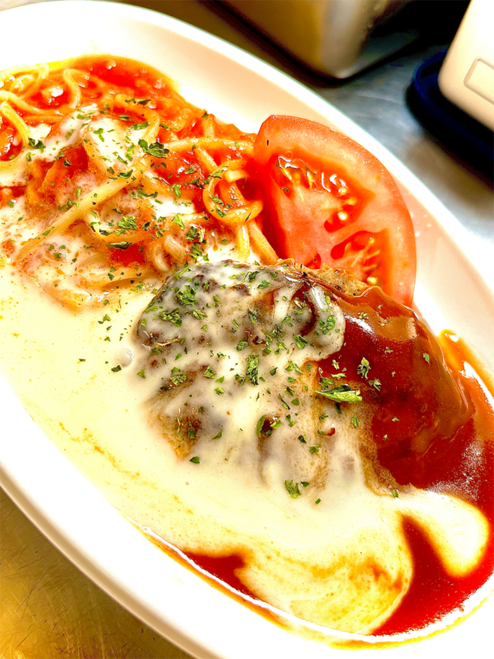 ポークカツレツに自家製トマトソースとチーズで食欲をそそります!